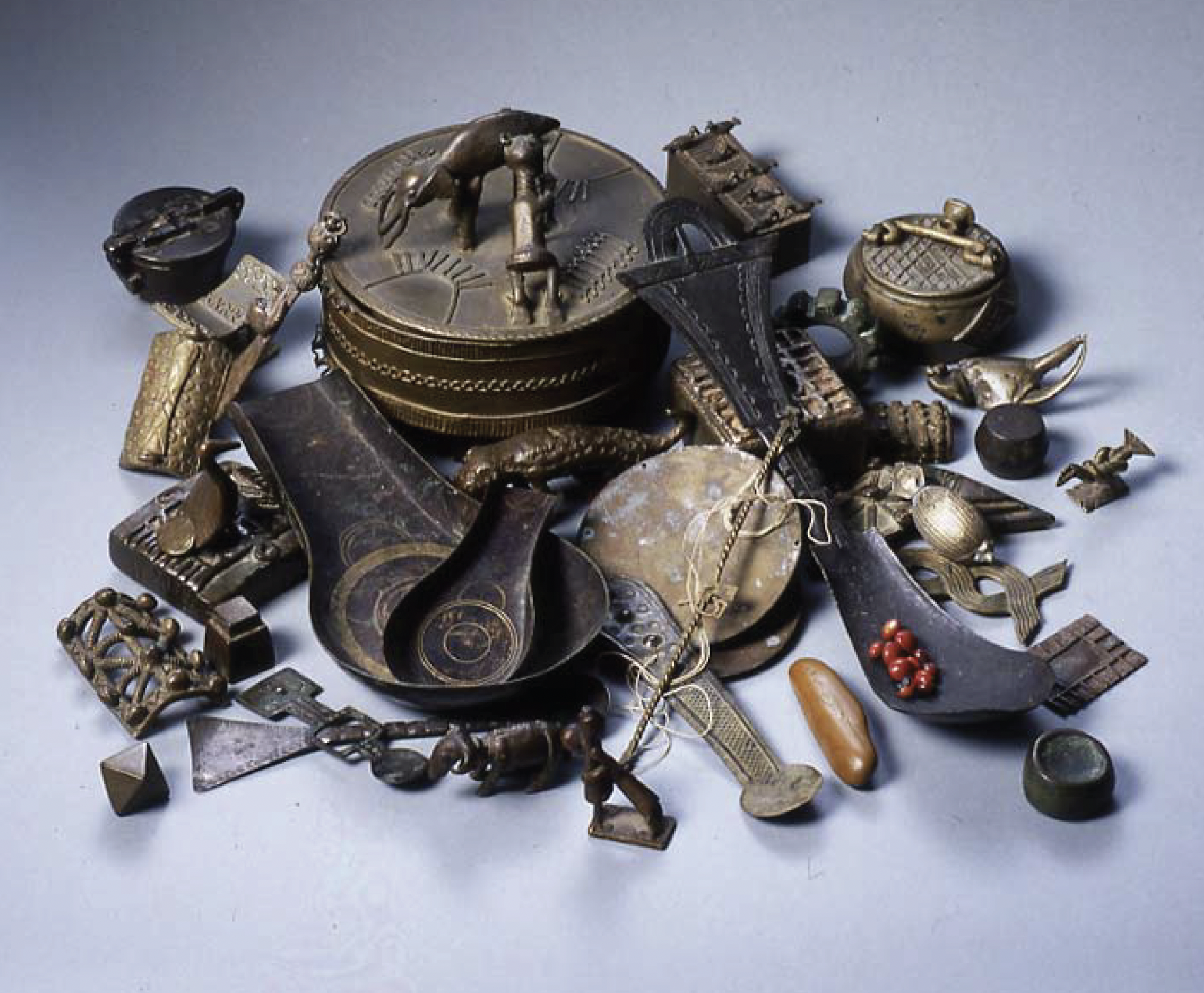 With the decline of gold dust as currency, goldweights fell out of daily use but continued to hold symbolic and familial importance. As Tom Phillips, a leading collector and author of African Goldweights, observed: “It would not be uncommon, as the Asante began to flourish as a nation in the early 18th century, for the head of a family to have a few dozen weights at least.”